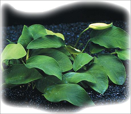 Die Anubia barteri nana kommt aus Westafrika und ist in ihren Ansprüchen sehr bescheiden und kaum Lichthungrig. Sie wächst zwar recht langsamm, dafür aber beständig. Sie hat sehr feste Blätter auf einen "kriechenden" Wurzelstock. Höhe so um die 5 - 8 cm. Perfekt, um sie auf Wurzeln zu binden (mit Angelschnur). Ihre feinen Wurzeln krallen sich an Wurzeln oder Steinen, womit man den Hintergrund dekorieren kann.