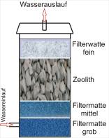 Die unteren zwei Lagen sollen das Wasser Mechanisch von grobem Schmutz befreien, das Zeolith arbeitet Biologisch. Durch die Form des Gesteins können sich zig Milliarden Bakterien an der hochporösen Oberfläche der Steinchen anlagern, und so das Wasser Optimal reinigen. Die feine Watte oben dient der letzten mechanischen Feinfilterung.