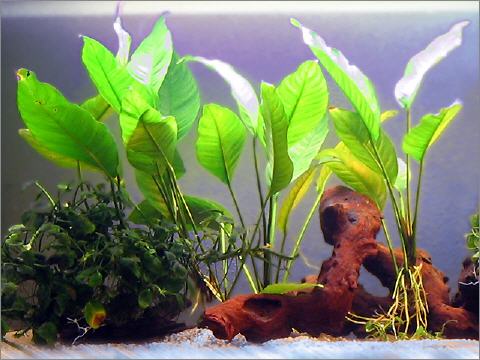 Diese Pflanze, auch 'Zwergspitzblatt' genannt, ist eine der robustesten und anspruchslosesten Pflanzen, die ich kenne. Sie ist eine Sumfpflanze der Familie der Aronstabgewächse. Da sie recht langsam wächst, erklärt sich der etwas höhere Preis im Zoohandel. Aber es lohnt sich! Sie wird etwa 15 cm hoch, hat Ledrige, unempfindliche Blätter und wächst sowohl im Kiesboden als auch auf Wurzeln und Steinen (mit Angelschnur befestigen). Weiches oder Hartes Wasser ist ihr egal. Sie benötigt nicht unbedingt direktes Licht, um Optimal zu gedeien. Sie Vermehrt sich durch Rizome (Ableger), treibt aber auch kleine, stielige Blüten aus, die wie kleine, weisse Zapfen aussehen.